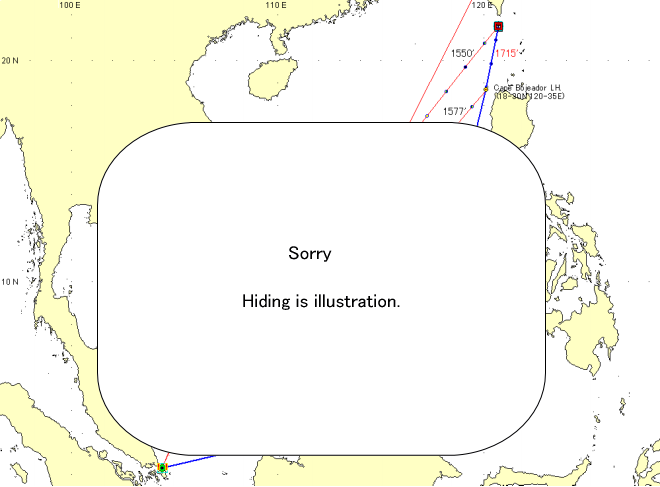 Light House(・・・-30N ・・・-35E) を・・・mileに見て台湾South endに向ける。他の航路(夏期航路/中央ルート@)より逆風弱く、Prince