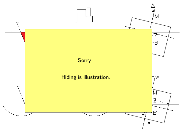 したがって、波によって持ち上げられた船(点線が元の水線)は、排水量が減り・・・・・・・・を失う。この結果・・・・・・は下がり、・・・もまた小さくなる。算式にあてはめて一目瞭然である。復原力は弱まり、大傾斜を生むことがわかる。