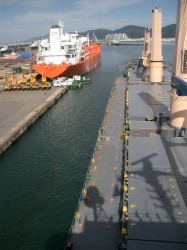 大型船の接岸速度は一般的に5〜10cm/sが妥当とされている(気象・海象条件を考慮しない)が、これは岸壁のFender性能(ゴムの弾性、防衝機能)にも大きく影響される。 小型船舶などでは岸壁にそのような防護材が設置されていないところに接岸する場合もかなりあるため、惰性で接近することは避け、岸壁手前で船を完全に停止させる(つもり)ように操船することが肝要である。 |