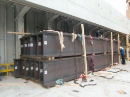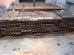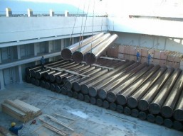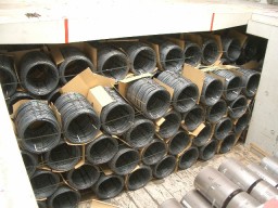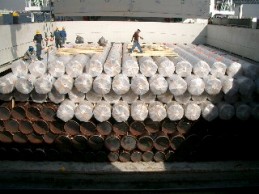 A大きなH形鋼除き、条鋼の製品荷姿(船積時)はパイリングして結束(bundle)しているものが多い。 BH-Beamは嵩を食うので、・・・・ぐらいになるが、他の条鋼材は・・・・と考えられる。 C荷役効率は遅く、・・・・t/day(・・hours)/gang程度。 Dウェイト勝ちなので通常・・・・t/m2ぐらいで・・・・に積載する。(ただしユニフォームロードが・・・・t/m2の船ならば、・・・t/m2ぐらいまでに抑えるのが望ましい。) E12m長には13m、6m長には6.5mの席でStowageする。12mものに12mの席では必ずはみ出して入りきらない。船なり基本だが、両サイドを船なりの切り積みにして、センター部を船横に積むなども在り得る。 F条鋼の上にPipeの追い積みなどは常套手段。(ユニフォームロード内) Gダンネージはsling掛け用の意味が大。わざと折れやすいダンネージを使用することもある。ガチャッといけば、条鋼でそれ以上の保定はない。飛び出しも発生しない。(但し圧損に弱い物には注意) |
