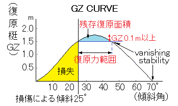 左図は、上記要件を図示したものである。GZ Curve(right armともいう)内の黄色部が船体損傷により25°傾いて、・・・・