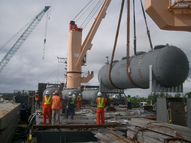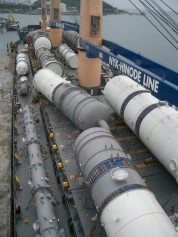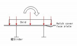 重量物船の経験が2-3年程度か、主に鋼材などを運び、100t程度ぐらいまでの重量物しか扱ったことのない航海士がよく間違うことがある。 ユニフォームロード(等分布荷重)は、甲板の1平米当たり何トンまで耐えられるか? と、いう概念である。 1000m2の甲板個所で、U/Lが4.0t/m2の場合には、重量の強度的にそこに4000tまで積載できるというものだ。この場合もちろん容積は考慮していない。 U/Lはハッチカバー、中甲板、タンクトップにそれぞれ設定されてあって、青図のMidship Sectionに書いてある。これも貨物積載には重要な要素であることは間違いないのだが・・・。 「重量物のSkid(脚)は、縦50cm x 横200cmが2本なので、 面積は 1m2 x 2本 =2m2 です。 2m2 x U/L 4.0t/m2 = 8t までしかデッキ強度は無理じゃないか? この貨物は30t ある。」 これが、3rdか、2ndの質問ならいいのだが、チーフがこんなことを平気で言う。