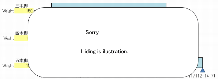 E = ・・・・・係数 (・・・・・kN/cm2) I = 断面二次モーメント ・・・・・・・・・・= 934,048 cm4 W = 荷重(150t) L = ポンツンの長さ δ=・・・・・・・・・・ = 3.4cm 一点集中荷重での公式 (・・・・) δ= ・・・・ 二点集中荷重での公式 (・・・・) δ= ・・・・ |