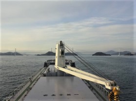 来島の中水道を南航するたび毎回これなのでほんとに肝を冷やしたもんだが、この船長は強運の持ち主(昔この方は犬吠埼沖付近で船が衝突沈没した際も無傷で救助されたらしい)で、どれだけ西航路にはみ出して行っても不思議と反航船がいないから事故にならないし、また浅瀬が来る前になんとか舵が効き始めた。ただ、我々は生きた心地がしないのである。