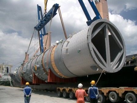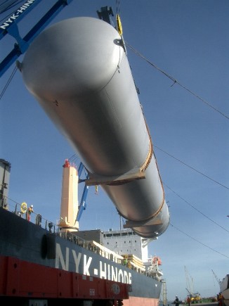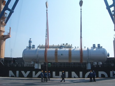 重量物荷役で最も重要なことは、貨物を平衡して揚げることです。10tや20tの貨物ではないので、不釣り合いに揚げたり下したりすると、甲板や受けトレーラーの局部に荷重をかけることになって、事故につながります。