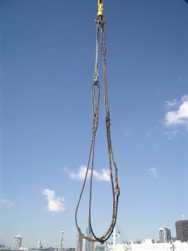 重量物荷役で使用するSling Wireは太く重い。60mm-70mmとなってくると、1本で500kg-700kgとなってきます。到底一人で動かしたりはできないのですけど、貨物に玉掛けする場合も、Lifting
