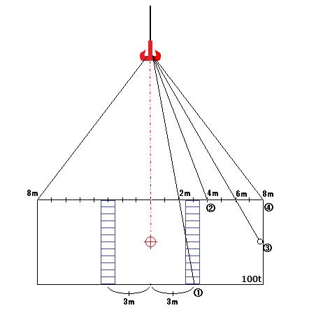 貨物の重心位置と、Lifting Pointの位置は決まっています。あとはきっちりSlingの・・・を算出し段取りすれば、吊った瞬間にピタリと重心位置を捉えるということになります。10cmでも間違うと貨物は傾きます。重心がずれるからですね。