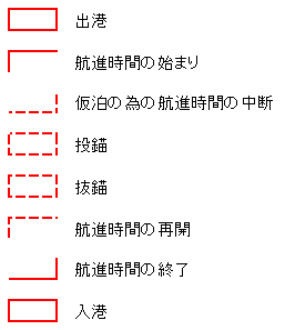 (Ring up eng.:機関使用用意解除) 〜 S/B eng. (Stand by eng.:機関使用用意)までを航進時間としている会社もあります。 航進時間の単位は6分で記載します。 |
