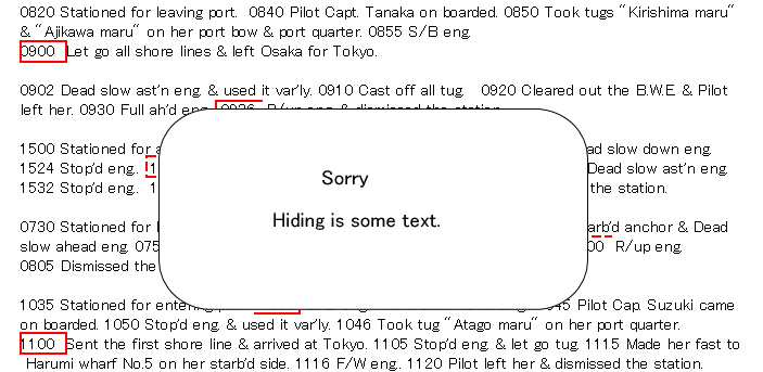 2. 日誌文は過去形で書きます。 3. 記事の前には必ず時間をいれます。 4. ペン書きです。 5. 誤記による訂正・削除は二本線で行い、語句を抹消してはいけません。 6. 1ワッチ(4時間)分は6行しかないので、記載事項が多くなる場合はあらかじめ定規などで増行します。 7. 記述にはパターンや略語があります。 |