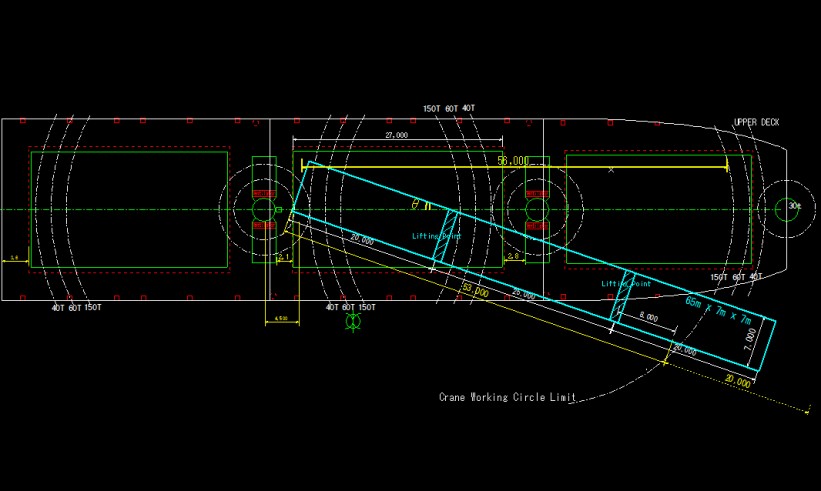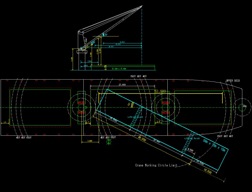 では、この船で同様の貨物なら何mまで中抜きできたか説明しよう。 図には、150tで吊る場合の・・・・・・・・・・を示してある。Craneの中心から・・・mの位置がそれで、そこから Craneの構造物に当たらない距離が、貨物の・・・・・から貨物端までの水平距離ということになるのだが、 作図上は・・・mである。<・・・m+・・・・・・・・間+・・・m=貨物長さ>となって、この・・・・・・・・・・間がわかれば、中 抜きできる最大長さがわかる。No.2CraneとNo.3Craneの・・・・・・・・・・の船首尾間距離は、・・・m-・・・m=・・・mであること から、・・・m+・・・m+・・・m=・・・m と、言いたいところだが、中抜きするときに斜めに入って行くため、その分を考慮しなけ ればならない。 今、作図上で仮に・・・・・・・・t間を・・・mにしてある。すると、No.2の・・・・・・・・・・にまだ余裕があることが わかる。(斜線のある部分が・・・・・・・・・・)約・・・mぐらいだろうか? ・・・m+・・・m+・・m+・・・m=・・・m 幅&高さ・・mだと、この長さまでは中抜きできることが 図面から読み取れる。ただし、その場合は、・・・・・・・・・・間が・・・mでも貨物自身の・・・がもてばということであるが。 何度・・・・・クレーン間の中へ入って行けるかが問題なのだが、ざっとしたものは、計算でも求めることができる。 θ= Sin-1(径(幅)+ 半径 / ・・・・・の長さ)= 34° ・・・m x Cosθ + ・・・m = ・・・m + ・・・m = 72m (マージンがあるので、こちらを採用しましょうか) 私なら、68-70m前後でこの船長と同じように躊躇したと思う。議論の余地を残すということだが、 計算上72mでいける物を、50mでやれないとは普通言えない。この割合を、重量で換算するなら、150tCRANEで、105tだから吊れないと言ってるのと同じことで、通常なら船長交代matterです。 この船長の意見(船を一端離岸し、回頭させて着岸舷を変えて揚荷する)が妥当だと運航者が認める貨物の長さは、70mだったとわかって頂けたと思いますが、 では幅/高さの限界はいかほどだったでしょうか? それが図3です。