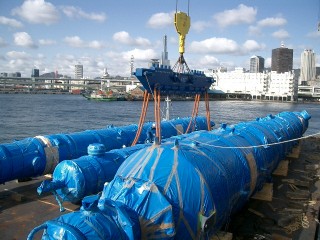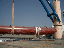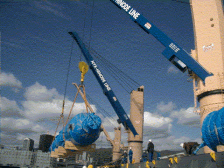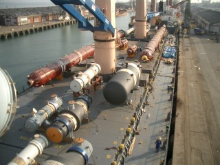 Snake in (Snake out)というようだ。 重量物船ではこういった荷役作業を避けられません。よくあります。 |