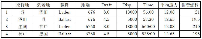 航海中の時間当たりの燃料消費量Cは、vを速力、Wを排水量として、 C = k・v3・W2/3 (kは比例定数) となる。燃料消費は速力の3乗、または排水量の2/3乗に比例する。要するに速力が上がれば、または、排水量が増えれば燃料がたくさんいるわけだ。1級(航海)の免状を持っている者なら誰でも知っている公式だが、それ未満の免状ではこれらに明るくない方も少なくない。内航の船長は3級で、こういったことに全く無であった。そしていくら説明してもわかってもらえなかった。 以下のデータで検証してみますね。 |