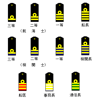 船長や航海士、機関士など船舶職員といわれる人が肩章(略式装)をつけたり袖に金モール(制服)を巻いたりしています。言わば士官の証です。左図のように三航・機士は1本、二等航・機士は2本、一航・機士、通信長、船医、パーサーは3本、船・機長は4本となっていますが、甲板部が金筋だけなのに対し、機関部では金筋の下部に紫線、無線部は緑線、事務部は白線、船医は赤線を施して各部を識別します。 ところが外航船であっても、練習船や客船、艦船等を除いて、・・・・・ |