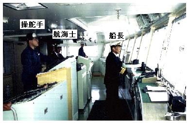左の写真は船長が操船する場合(狭水道通過、出入港、危険が切迫する場合等)の通常配置です。船長がブリッジ前面に立ち、操船号令をかけます。そして、操舵手がそれに従って舵を切ります。 |