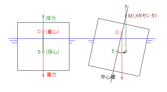 UPRIGHT時の浮力の作用線と、傾斜時の作用線の交点がメタセンタMで、そこから重心までの距離GMが復元性に大きな影響を及ぼします。GMの距離が・・・・・ GMやSTABILITYに関しては、国家試験にも出題される問題で、突き詰めれば1冊の本になるほど複雑ですので、この辺にしときます。 |