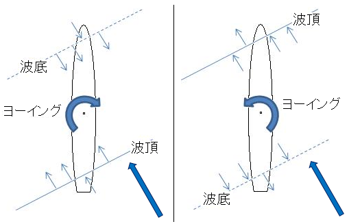 波には回転運動が起こっていて、波頂部ではその・・・方向に、波底部ではそれとは・・・方向に水が移動している。この力は瞬間的に船を・・・・・・・・・・・・となり、船が針路から逸れる現象を起こす。これをヨーイングという。