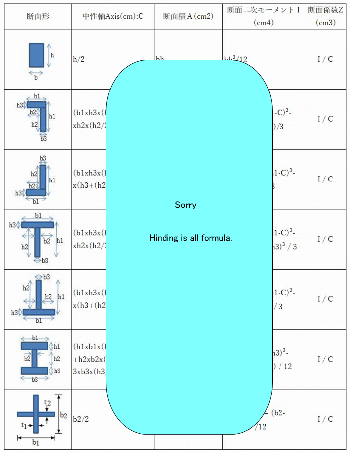 断面二次モーメントと断面係数の求め方 重量物などの保定等で曲げ強度ををやるときには、断面にモーメントと断面係数が不可欠(活用方法は「重量物の保定」のページをご覧ください。)です。その定義式は積分で表され難しそうですが、実際に計算す場合には四則計算で行えますので、エクセルにずらずらとで計算式を代入すれば簡単に計算できます。 ですのでここに船で使用しそうな代表的な資材の形状について、断面二次モーメント(the second moment of area)等の計算方法を記しておきます。ご利用ください。 特筆すべきは、同形状であっても上下を逆にすることによって断面係数が異なるということです。従って、(Stopper等に)使用するときには強度が変わるので方向を間違わないようにしたい。期待する強度を得られない場合があります。 |