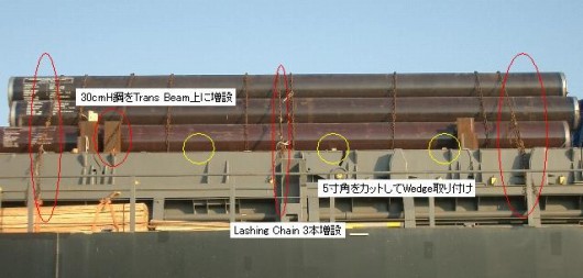 Securingの強度不足が発覚し、次港で、H-beamと、Lashingを増設した悪い例。 |