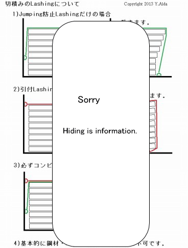 更に安全を期したい場合は、・・・・段目を・・・・・方向に何列か・・・・・しで一体化(これはWebbingでも良い)させたり、最上段のサイド・・・・・本をに・・・・・して・・・・・方向斜めにラッシングして・・・・・に引きつけたりする。(カップリングしているものは中通しでなく、回すなりしてそれ相応のやり方で)