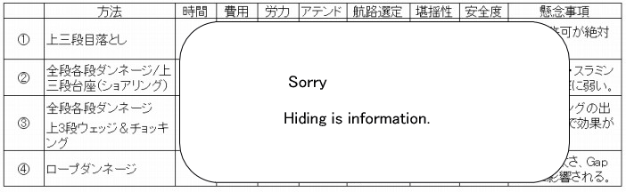 次になぜ私が、Cのロープダンネージでなく、Bを推奨するかを述べたい。うちの場合、各段ダンネージ積みで荷崩れ事故を起こすほぼ全てがこれです。ロープダンネージがあたかも・・・・・と同等の効果があると考え、アテンドに行かず・・・・・にも気を配らないから大事に至る。(出来具合を知らずしては・・・・・も考慮できない。)