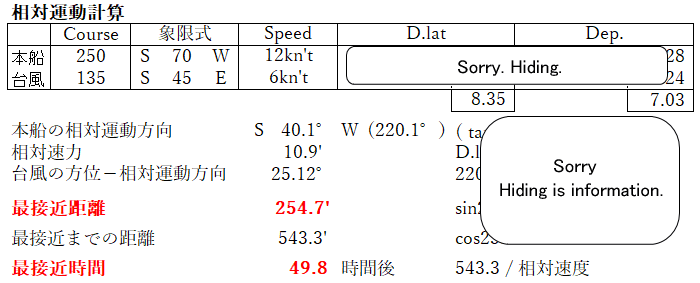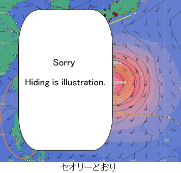 話を本筋に戻そう。要するに、ここまで荒天予想が済まされているということは、航路選定のお膳立てが労せず全て整っているということであるから、8割がた終わったも同然です。あと必要なのは避航のセオリーだけなのです。 自分がいつまでも裁量できるよう後生大事にひた隠ししているそのセオリーをここに示します。 昔のセオリーは台風の・・・半円で・・・mile、・・・半円で・・・mile離すなどと単純明解だったが、今は温暖化の影響か台風が度々強大化していることや、進路が迷走することなどの負の要因が追加されたことに反して、細かい情報が得られるという良い傾向もあるので、やや複雑化している。それでも、動作は大別して、行くか(このままコースを保つか)、行かないか(時化を避けるか)しかない。しかし、どちらにしても、その明確な根拠が必要になる。