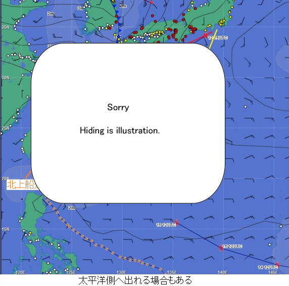 できましたか? ほう、それは相当すごいです。驕りが! 気象予報士さんほど勉強してるならざしらず、こななもんでなにゃわかんのよ。と、私は思う。 せいぜい日本近海の海流と、高気圧からの吹き出し、台風周りの風だが風速はいまいちわかりにくいですね。重要な台風の進路も予想つかない。高気圧にどう回り込む? 台風はすでに温帯域に入っりはじめているから偏西風の影響を受け始める。高層の天気図も欲しい。東の台風は前線に沿って走りそうだが、西の台風もセオリー通り行くか?私らにはここまでが関の山で、これじゃ素人とかわりない。こんなもんでは航路選定できない。 台風の今後の進路が予想つきません。そうです。台風の現在までの軌跡がありません。私が意図的に抜いているからです。これでは、さすがの自称グレートキャプテンでも手も足も出ない筈なのですけど。??? さあ、いよいよ上の天気図にマウスオンしてください。 ・台風の進路 ・Wave height/Direction ・Wind Barbs ・Current ・Visibility あらゆる情報が入っています。ここからの航路選定は先ほどの物より、よっぽど容易ではありませんか?そういうことなのです。気張ったところで、敵わない。できたと言ったあなた! 本当にここまで予想できていたのですね?と言いたい。 今この時代、世界の海を知り尽くしたそんな船長などは、ほとんどいない。(フィリピン人やインド人、欧州人辺りには船長履歴10年なんてのがたまにいる) あの港、この海域に何回か行ったことはあるという人間はたくさんいる。しかしよく聞いてみると3rdのときにや、2ndのときだという、船長としての経験でなければ説得力なく、それはいかにも心もとない。 そのかわり、現代ではグレートキャプテンに勝るとも劣らない気象予報システムが開発されています。これは1枚の天気図ではない。1時間おきの各時観測情報が連なって情報として入り、人間が経験を元に想像する範囲をはるかに超えて予報してくれている。何より台風の予想コースが格段に信用でき、荒天範囲も手に取るようにわかる。さらにはその画面上で、本船の航行をシミュレートできるのだから、その昔最も重要視された船長の経験知識に匹敵するものが、今は簡単に得られるのである。 最終決断は法のもと、船長がやるのです。積荷の状態、スケジュールは担当海技員とオペレーション担当が一番知っている。避航路/避泊の推奨や希望は彼らがやった方がよい。一方、本船の現在の状態(性能・現海象)は本船船長でないと把握できない。だから、本来はその間に部長などの優位的立場からの介入を行うべきではなく、権限委譲されなければ逆に危ない。
