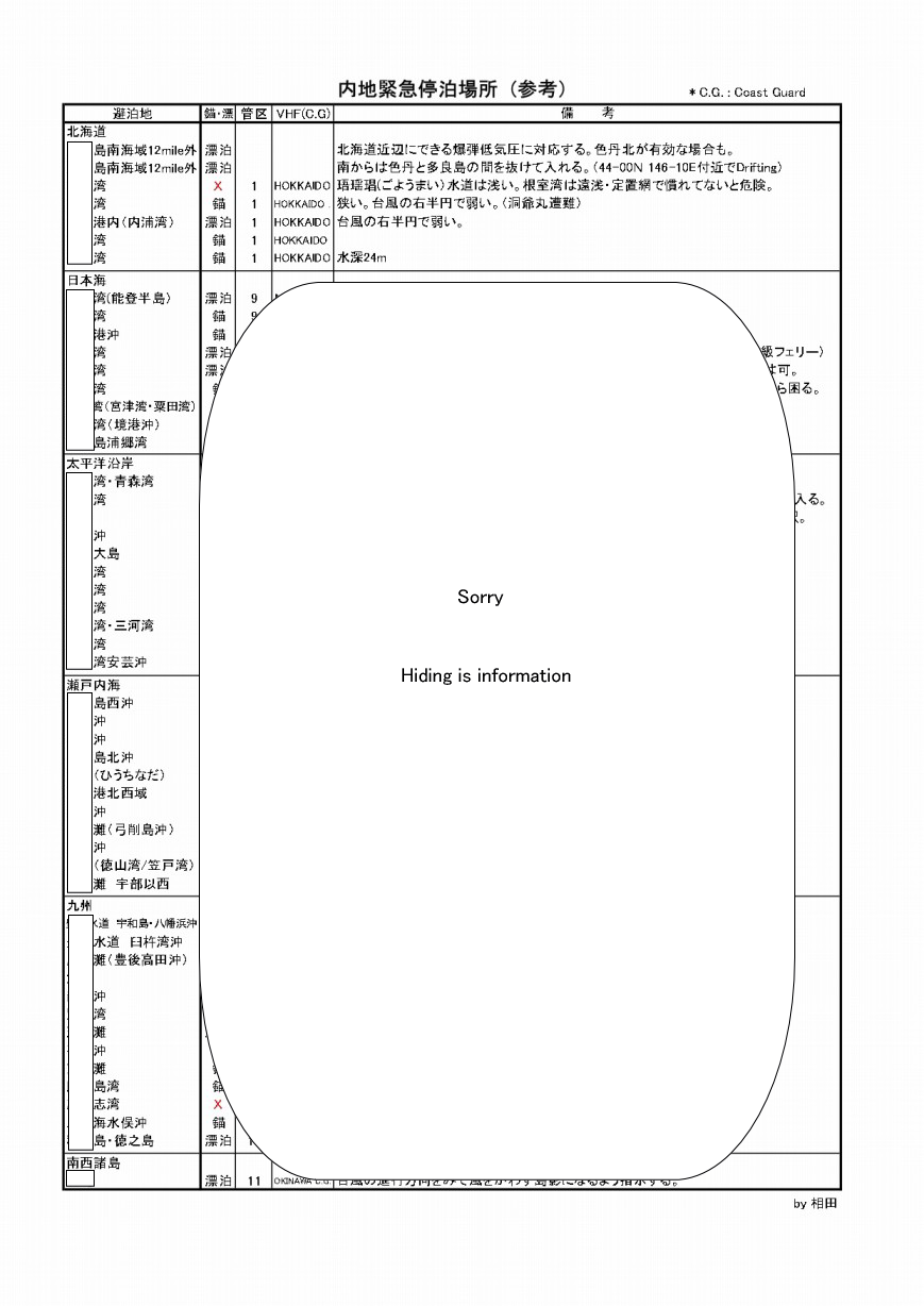 内地での荒天避航やバース待ち等で、必ずと言っていいほどの勘違いがあります。 「バース待ちが5日間ありますので、・・・・・・・・・・させていいですか?」 「このまま行けば、・・m高波域があるので、・・・・・・・・・・・・・させます。」 などです。 フィリピンや中国、韓国等外地ではこういったことが各所・・・・・・・・・・であるため、誤解をするのでしょうが、日本サイド(保安庁)は・・・・・・・・・・・・・です。外国籍の船が領海内で・・・・・・・・・・・・・・・・・・ことはできません。保安庁から・・・・・・・・・・ます。 ・・・・・・・・・・・・・・・があるのは、おおむね入港地及び出港地のみと考えらます。ですがそれも、ご存知のとおり、入港地で・・・・・・・・・・時間制限があったり、出港地も・・・・・・・・・・というのが一般的で、・・・・・・・・・・されません。そこで「まず代理店に聞いてみろ」と言われるのです。 その他、入港(・・・・・・・・・・・・・・・・・・・・)が認められるのは、・・・・・・・・・・・・・・・・がある場合に限られます。言い換えれば・・・・・・であることが要件なのです。だから、台風通過の・・・・・・・・・・前で、未だ揺れてもいない時期から「・・・・・入港だ」と言っても認めらるはずがないのはわかって戴けますね。 ただ、「進航方向に・・・・・・・・・・があって、このまま航海すれば・・・・・・・・・・・・・・・・が予想されるので、・・・・・・・・・」は許可される場合があります。 時期や状況、理由など正当性の判断がなかなか難しく、また・・・管、・・・管、・・・管などは説得しにくいが、その他の管轄管区(・・・管)は融通をきかせてくれることもある。など、さまざまな角度でグレーゾーンがある。 上記の関連法規は 港則法10条、26条、29条、31条、37条 特定港・・・・港(水深があって・・・・・が常時出入する港)で、港長は航行の・・・・・・・・・・・・・を命令できる。などと書かれています。 これは、港ごとの対応(・・・・・・・・)となっていて危険を防止し、混雑を緩和するためである。 (着岸中に発せられる・・・・・・・・については、・・・・・・・・・はなく、離桟の決断はあくまでも・・・・・に委ねられる。と、・・・・協会は見解している。但し、これによってる生じる責任は別) これに対し、平成20年施行の「・・・・・・・・・・・・・・・・・・・・・・に関する法律」(・・・・・・・・・・について)では、 第・・条 ・・・・・・・・・・は、領海内等において・・・・・・・・・・・・・・・・・・・・・・・・・・・・・・・・・・・・・・・・・・・・・・・・・・がある場合はこの限りでない。 (ただし、ここに・・・・・・・・・権はあり、平和・安全を害さない限り・・・・・・・・・・通航できる。・・・・・は害があるとみなされダメ) 第・・・条 外国船の船長等は領海等において・・・・・・・・・・・・・・・・・・・・・・・・・・・・・・・・・・・・・・・・・・・・・・・・・・・・・・・・・・理由等を最寄の海上保安庁事務所に・・・・・・・・・しなければならない。 と、船長への・・・・・・・を課している。 *しかしながら、前文でも紹介したとおり、台風避難だと言っても、早い段階(切迫していないと)だと保安庁は港・・・・・・・・・・される(錨地には限りがある。・・・・・・・・・のために錨地を空けといてやりたい気持ちもわかる。)し、かといって、遅くなればなるほど錨泊地は詰まってきて入れない。ジレンマがある。こちらからすれば「大荒れになったのちに、・・・・・・・・・・・・に入って行くぞ!・・・・・・?」と、なるわけだ。 現行日本では、・・・・・・・・・・・・・・・・・・・・場合を除いて、自国の内水・領海を避難水域として利用することを、よっぽどのこと(荷崩れ、機関故障等)がない限り・・・・・・・・・・に拒否される。と考えておいた方が無難。(これは日本人が乗っていてもです)・・・・・・・・・・・・・・・・・・管)などは特に顕著である。 よって「・・・・・・・・・・・・・のための錨泊だ」などと口が裂けても本船に言わせてはならないということになります。なるものもならなくなる。 オペレーション業務として船社(運航者)から保安庁にお願いをする等に異論を唱える方もいるようだが、避泊に関し、・・・・・・・・・・・・・・・・・・・・・・に頭を下げに行ってくれている。(・・・・・・・・・・・が港長まで行って泊めてくれと交渉するか?) 航海中、・・・・・・・・・・・・・してやって、なんの不都合があるのかと、私は思う。 根拠:「・・・・・・・・・・・・・・・・・・・・・・・・・・・・・・・・・・・・条3項には、外国船舶の船長等がしなければならない・・・・・は、当該外国船舶の・・・・・・・・・・
