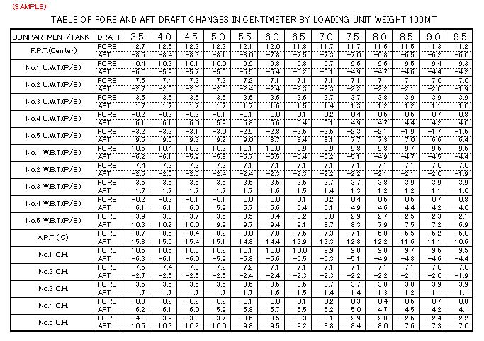 2)Table は 100t を積載することによる船首・船尾の増減を +、-、の符号で示しているので、各ハッチの積み付け量を比例配分して、喫水変化量を求め、その総和で最終の喫水を知る。 例えば、上表を用いて、20,500t の積載量を各ホールドに振り分けた後の喫水変化量は、(平均ドラフトを6.0mとした。)
